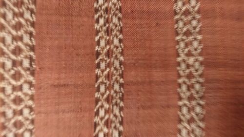 今日は、縞に抽象模様織り出しの手織り紬です。購入時期や価格は不明です。結構古い生地のようですが、生地はまだしっかりしています。 茶色に抽象模様のストライプが走っていて面白い生地です。着物を解いたのか、生地の状態になっているものを買ったかは記…