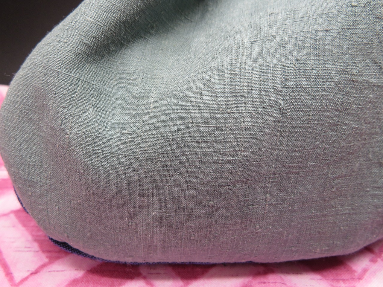 さて、今回は、重要無形文化財クラスの結城紬のハギレで、底付巾着を作りました。底の部分は、紺地の手織り真綿紬の着物を解いて、あまった衽の部分を使っています。