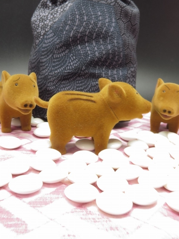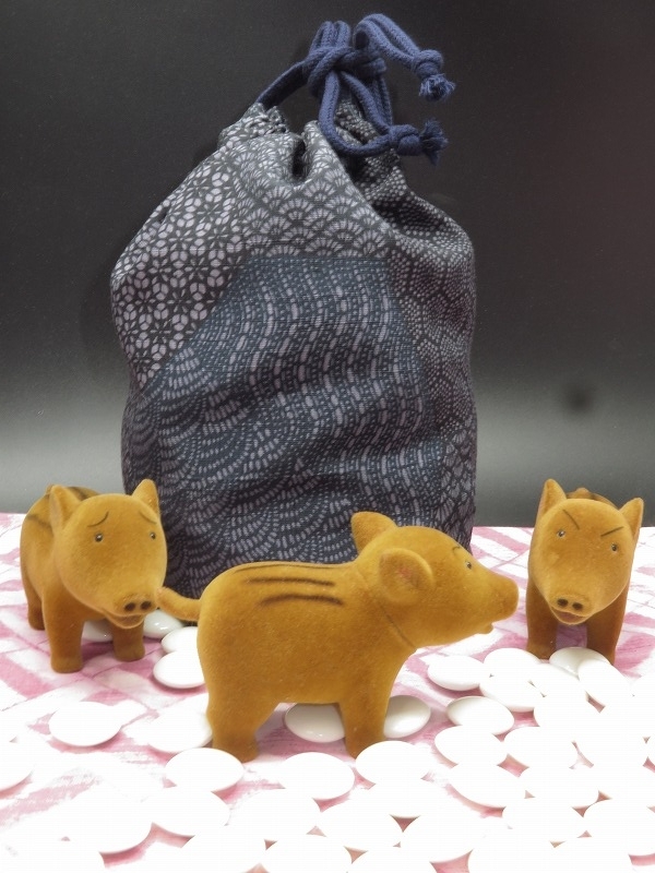 思わず、ウリボウ達を巾着の上に乗せてみたくなりました。やや紫がかった紺色ですが、シックなデザインと切り嵌め調の様々なデザインは、見ていて飽きが来ないと思います。