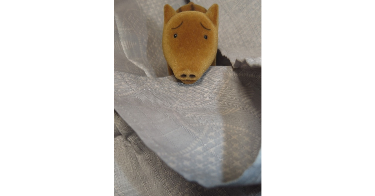 例によってウリボウにも登場してもらい、生地の色合いを見るうえでの、参考にしていただけばと思います。ウリボウは茶色です。