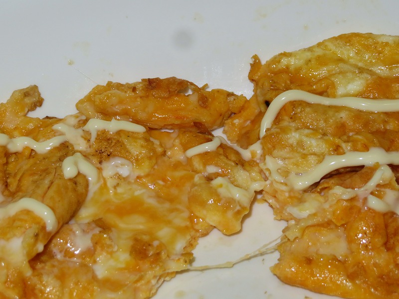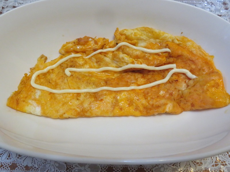 たったそれだけです。今回はタマゴ焼きをひっくり返すのに集中しすぎてマヨネーズを入れて折りたたむのを忘れました。面倒なので、タマゴ焼きの上からマヨネーズをかけて終わりです。