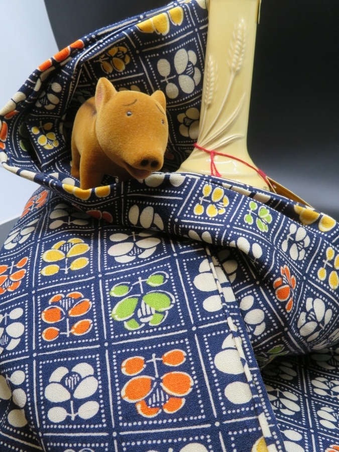 多少大ぶりな柄ですが、紺地に朱と黄緑と白の抽象花模様葉がとても印象的だと思います。