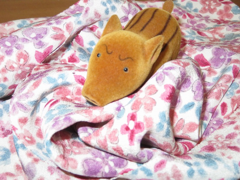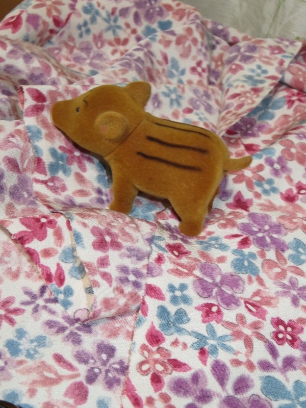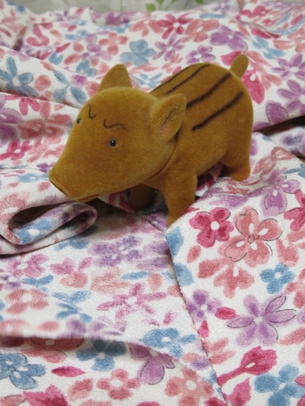 ウリボウの茶色と桃色の生地のコントラストをお楽しみいただければと思います。