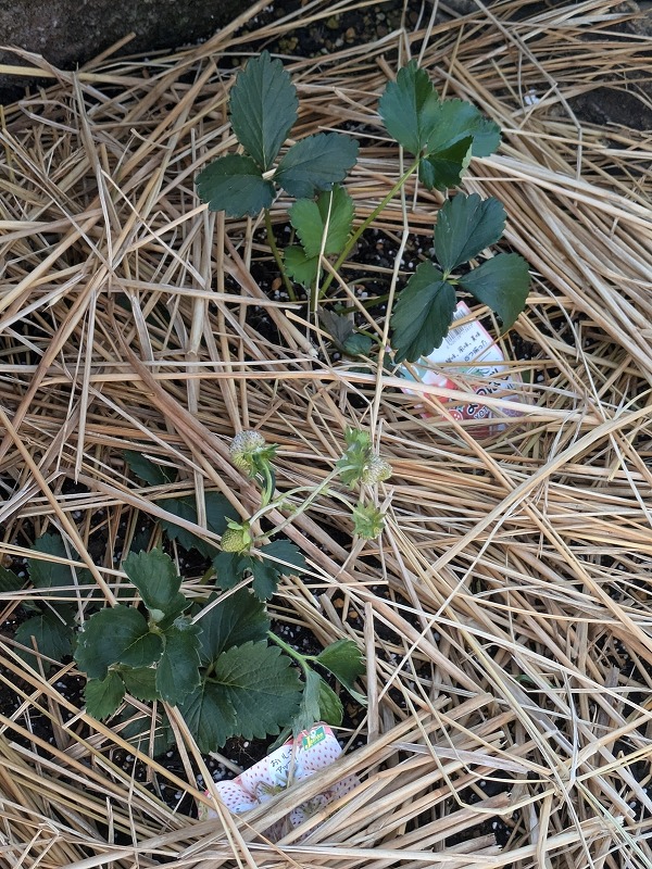 直接地面にイチゴが触れると虫の被害も気になりますので、藁を敷いて良かったと思います。少しずつ実も大きくなってきました。